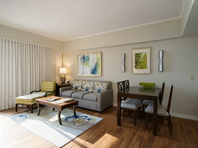 カリアタワーの1LDKのお部屋は間取りが広くいスィートタイプです。モダンなインテリアで爽やかな雰囲気です。大きめのダイニングテーブルがあり、ご家族でのお食事に最適です。オーシャンビューとマウンテンビューがあります。カップルまたは家族4人でのご滞在におすすめのお部屋です。